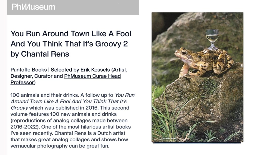 Recent arrival with very long title: You Run Around Town Like a Fool and You Think That It’s Groovy by Chantal Rens presents collages of wild and domesticated animals with beverages balanced on their backsides. Published by @pantoflebooks in Tilburg. Edition of 500. $30
