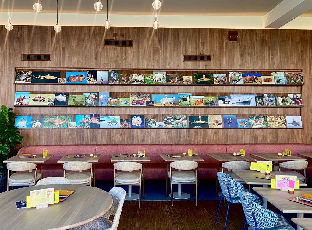 (…) 彼女の作品からは、オランダらしいレンガの家のスペシャルケースに入ったポストカードセットや、お酒の入ったグラスを背中にのせた動物たちのポストカードセット、その他ステッカーやマグネット、ミニカードやバッジなど、ユーモラスで愛らしい動物アイテムたちを販売します。(…)フェアの売上の一部は動物実験の廃止を求める市民団体〈JAVA〉への寄付金として運用させていただきます。